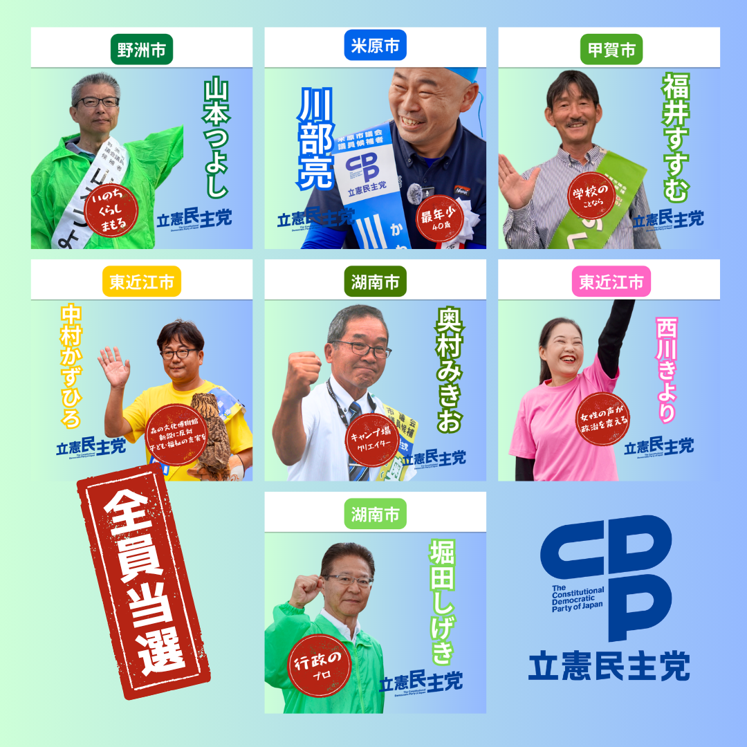 野洲市・甲賀市・湖南市・東近江市・米原市 7名(公認6/推薦1)が全員当選を果たすことができました。