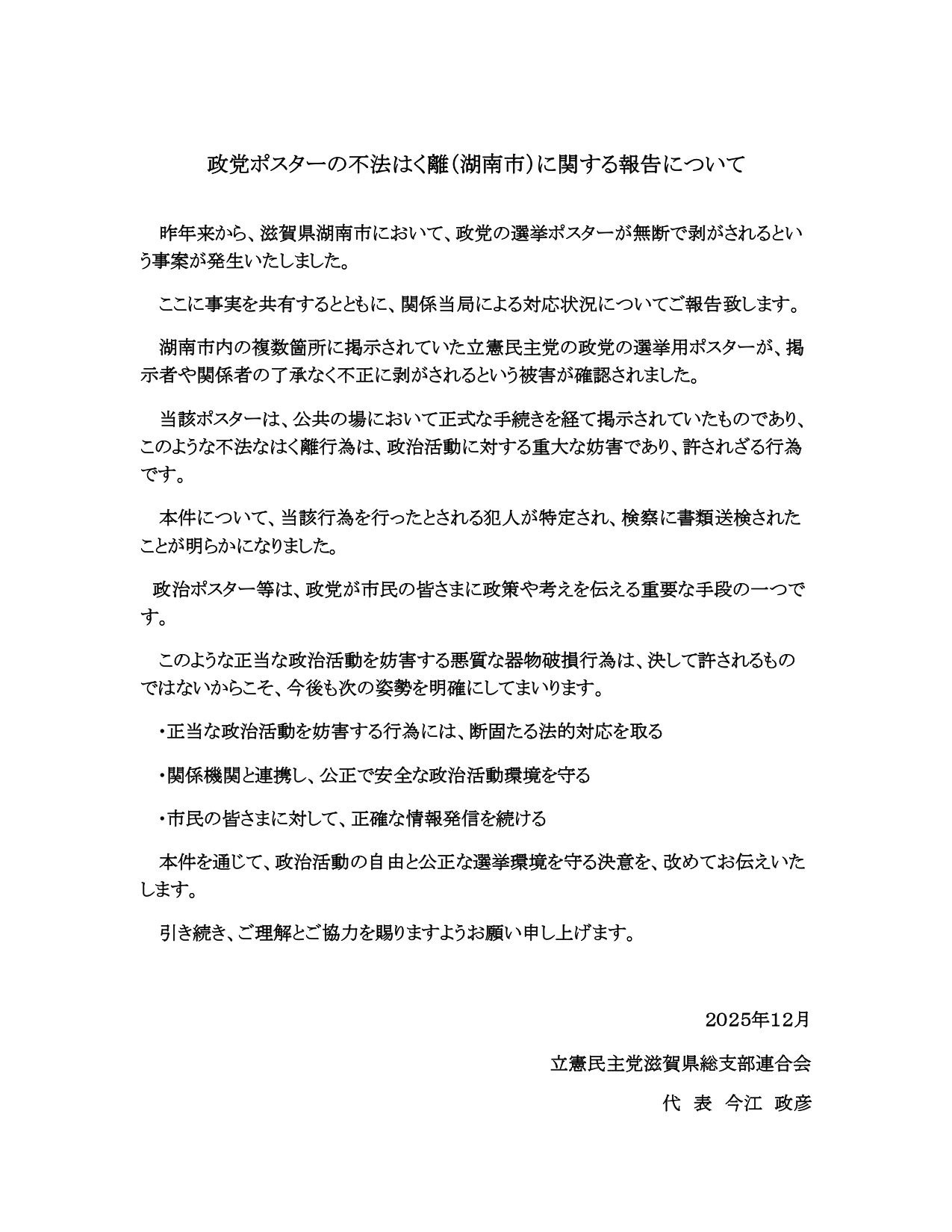 政党ポスター不法はく離(湖南市)に関する報告【声明】
